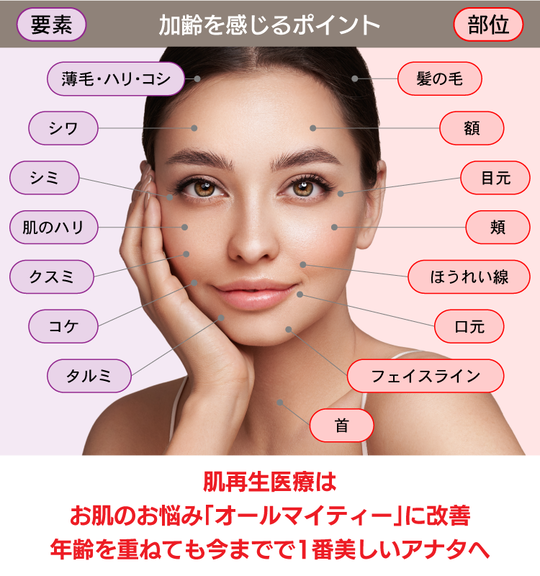肌再生医療はそんな悩み箇所を自然にエイジングし、たるみ・シワ・毛穴・ニキビ跡などを改善し、