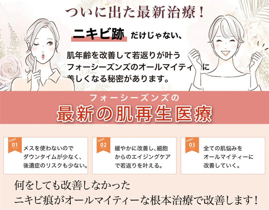 フォーシズンズではニキビ跡クレーター、炎症後色素沈着や慢性炎症、酷いにきび、吹き出物、酒さなどをより早く治すためにもニキビが出来る「原因」を根本治療することが大切で悩みを繰り返さない為にも自己の血液中の成長因子・サイトカインを培養して注入するACRS療法サイトカインリッチ”を注入し、若い頃のような肌状態をリセットしニキビ・ニキビ跡・アトピー・肝斑などの皮膚疾患を根本治療し、酷いニキビ跡・クレーター肌・ボコボコした凹凸肌・毛穴の開きなど特に効果的です。
